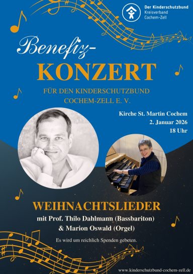 Am 2. Januar 2026 fand in der Kirche St. Martin in Cochem ein beeindruckendes Benefizkonzert zugunsten des Kinderschutzbundes Cochem-Zell e. V. statt. Der bekannte Bassbariton Thilo Dahlmann aus Köln und dem Kreis Cochem-Zell sowie die Kirchenmusikerin Marion Oswald von der Pfarrei Hl. Maria Magdalena Cochem begeisterten das Publikum mit einer Auswahl festlicher Weihnachtslieder, die sie einfühlsam mit Gesang, Orgel und E-Piano präsentierten. Die Darbietung war ein wahres Feuerwerk an musikalischer Vielfalt und ein Genuss zum Jahresanfang.